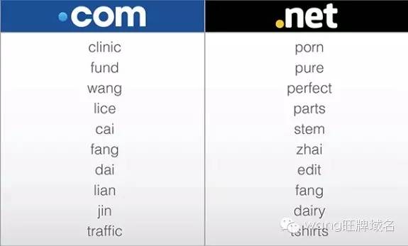 从图中可以看出,注册.com的前10扩展名的关键词中有6个中文拼音,而wang位列第一,更是全球前10名关键词的第三!