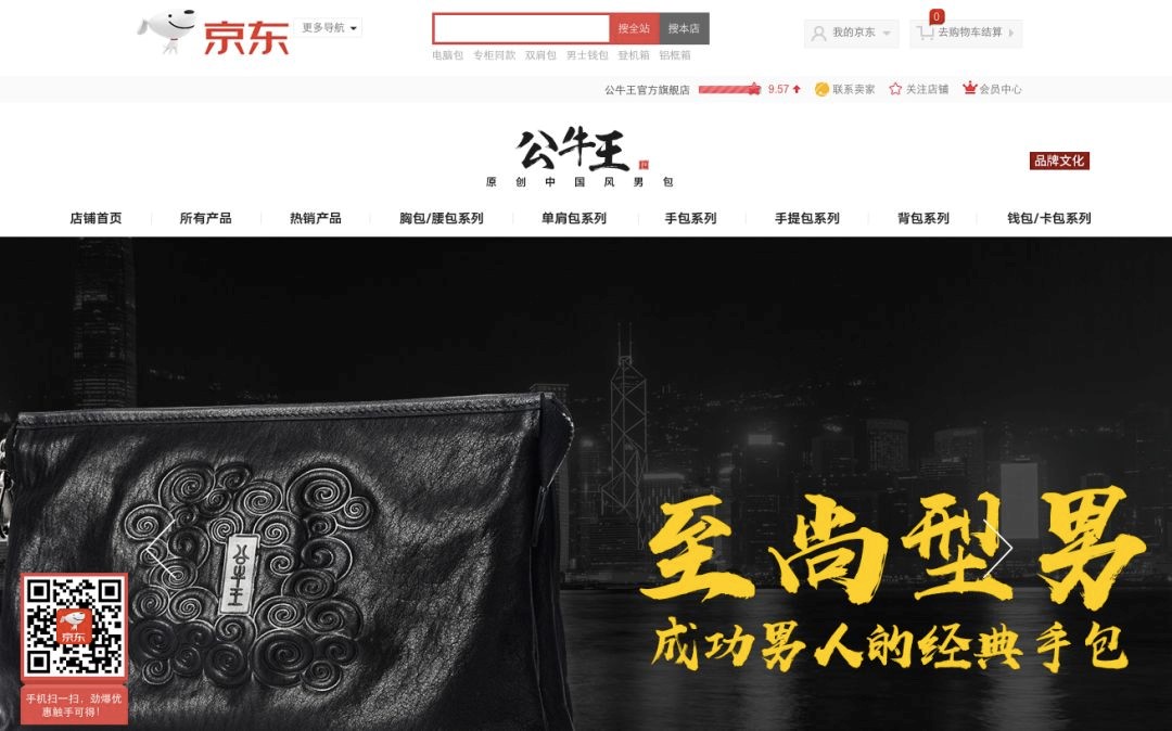 京东上就有一家名叫“公牛王”的原创中国风男包旗舰店,商品覆盖了腰包、单肩包、手包、手提包、背包、钱包、卡包等,应有尽有,价格在数百元不等。