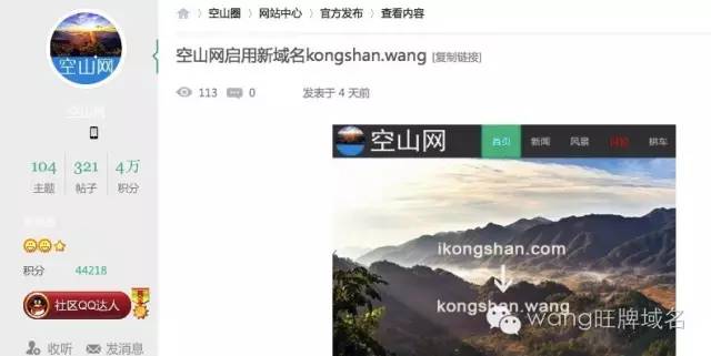 据了解,空山网的原域名是是ikongshan.com,于2014年5月注册并启用。其中,字母“i”有“我、爱”之义,组合起来就是“我空山、爱空山”的意思。虽然ikongshan.com表达了空山人民对家乡的热爱,但依然不够与网站契合,也不容易记忆!我们再看目前启用的新域名kongshan.wang,直接对应“空山网”,与网站名称高度契合,而且更有创新,也更容易让空山人民记忆,便于输入。